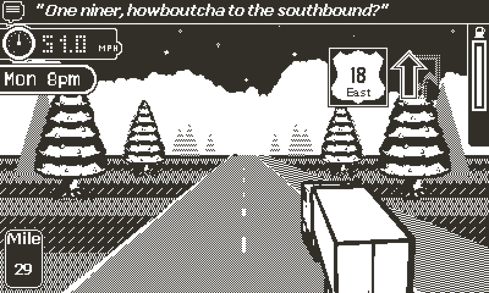 *ksch* Breaker one-nine, eastbound icebox, traffic cleared up. Put the hammer down, over.